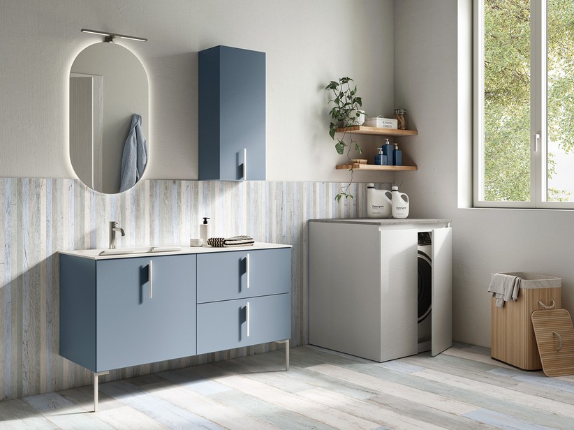 DESK floor-standing bathroom-laundry unit cm. W130 composed of a washbasin base in melamine-faced laminate with a matt Avio Blue finish cm. W130xD50xH58 with 1 left-opening door with soft-close and 2 soft-close drawers - Handles and pair of metal feet in Matt White - Unitop OKRY washbasin 130x50 cm with left-hand basin in Ocritech with foldable wiper board in the same colour as the drain cover - Matt White