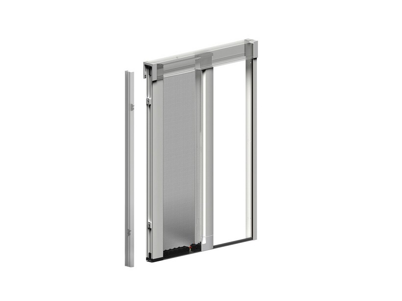 Mosquito screen without a button but with a bottom sliding track, side roll-up, suitable for French windows, with a modern square frame. Ergonomic grip along the entire profile makes it easy to open from both inside and outside. Although spring-loaded, the opening is smooth and always controlled, without the danger of jerks and sudden retraction. The ground guide of only 5mm does not create any stumbling. Thanks to the bayonet clip, fastening is ultra-quick and allows release during periods of non-use. Available with a light frame only, or with recessed rails, making it one of the best-selling models on the market. For one or two doors, with a choice of frame colours. Maximum widths up to 1600mm for single leaf, up to 3200mm for double leaf and heights up to 2800mm.