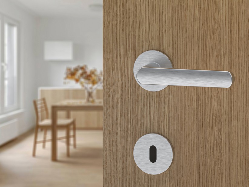 Handle composed of a double grip with rosette, double escutcheon with key hole and small parts for installation.