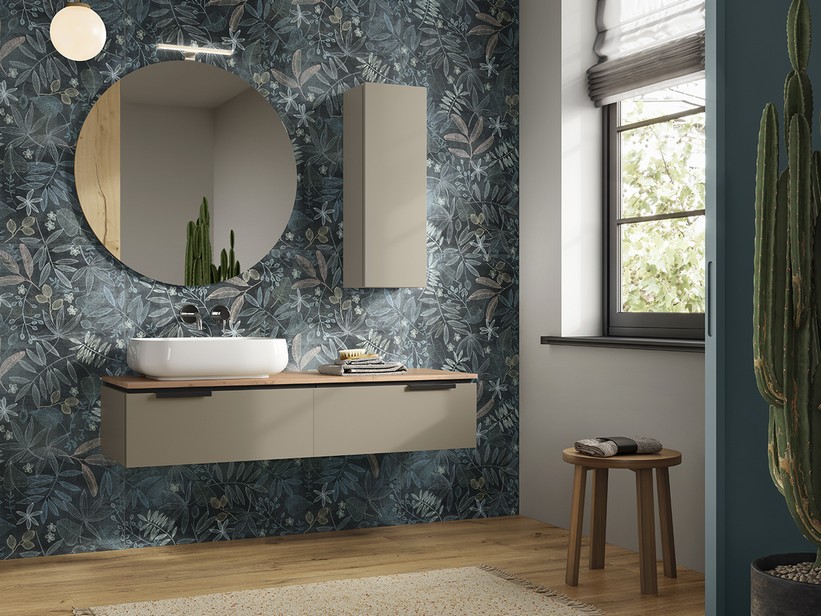 TOUCH suspended bathroom cabinet cm. L140 composed of a washbasin base in MDF covered in matt dove grey PET cm. L140xD51.5 with 2 soft-closing drawers with matt black handles