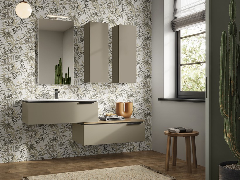 TOUCH suspended bathroom cabinet cm. L90 composed of a washbasin base in MDF covered in matt dove grey PET cm. L90xD51.5 with 1 soft-close drawer with matt black handle