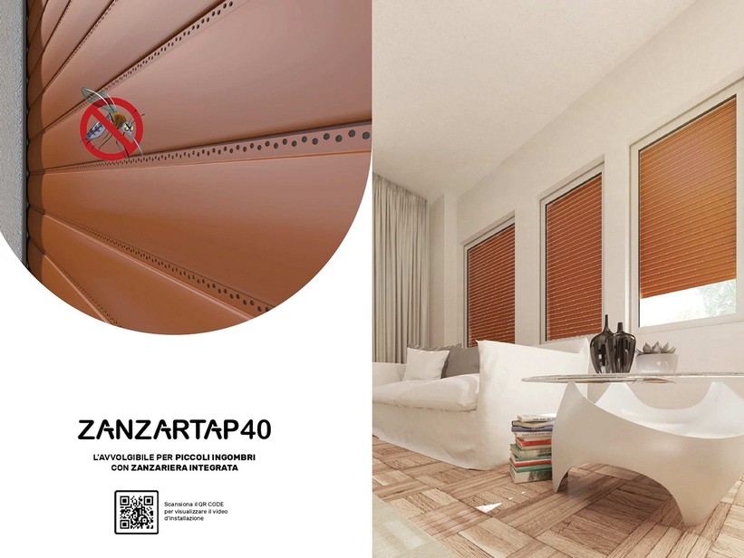 Aluminium roller shutters insulated with ZANZARTAP medium density polyurethane and with the special feature that the slot is microperforated, this allows for a gradual entry of light but at the same time good air circulation in the semi-closed position. Rolling shutter with a 50 mm high slat available in various colours, with rubber or aluminium end caps. Also available in the ZANZARTAP HD version insulated with high-density polyurethane, and in the ZANZARTAP 40 HD version with the slat height lowered to 40 mm, made with high-density polyurethane as insulation. Many colours available.Maximum permitted width up to 4200 mm for Zanzartap.Maximum permitted width up to 3000 mm for Zanzartap 40 HD.