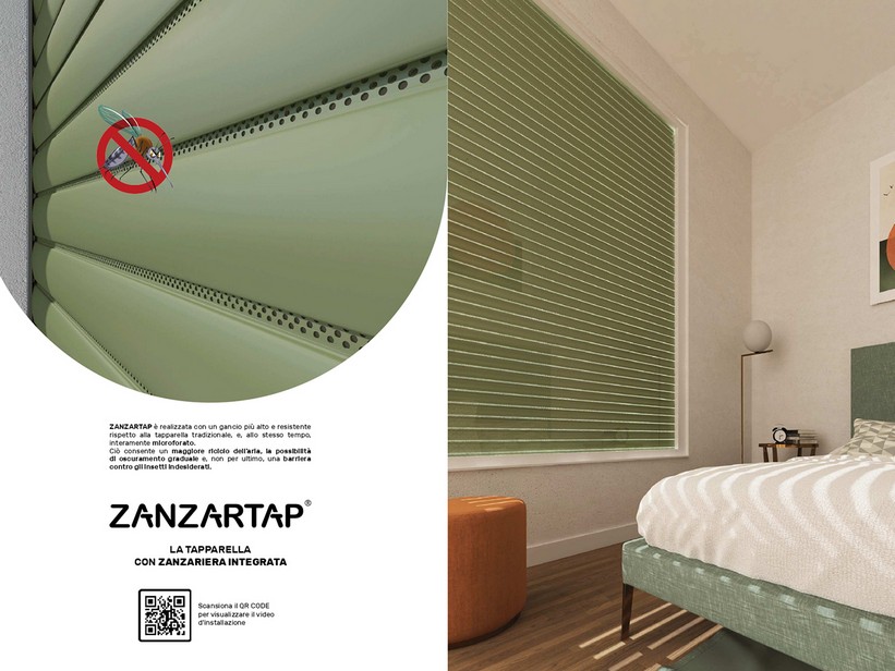Aluminium roller shutters insulated with ZANZARTAP medium density polyurethane and with the special feature that the slot is microperforated, this allows for a gradual entry of light but at the same time good air circulation in the semi-closed position. Rolling shutter with a 50 mm high slat available in various colours, with rubber or aluminium end caps. Also available in the ZANZARTAP HD version insulated with high-density polyurethane, and in the ZANZARTAP 40 HD version with the slat height lowered to 40 mm, made with high-density polyurethane as insulation. Many colours available.Maximum permitted width up to 4200 mm for Zanzartap.Maximum permitted width up to 3000 mm for Zanzartap 40 HD.